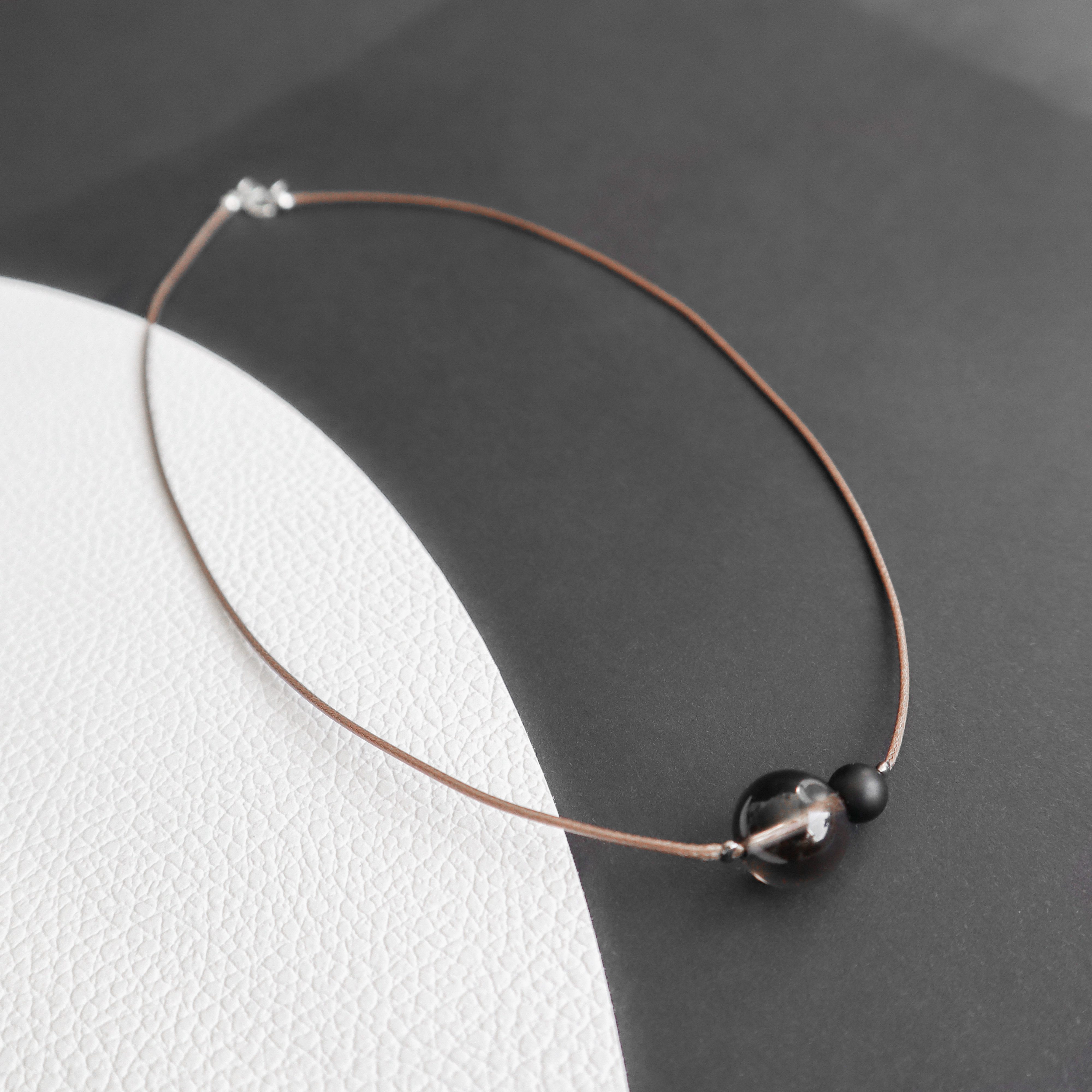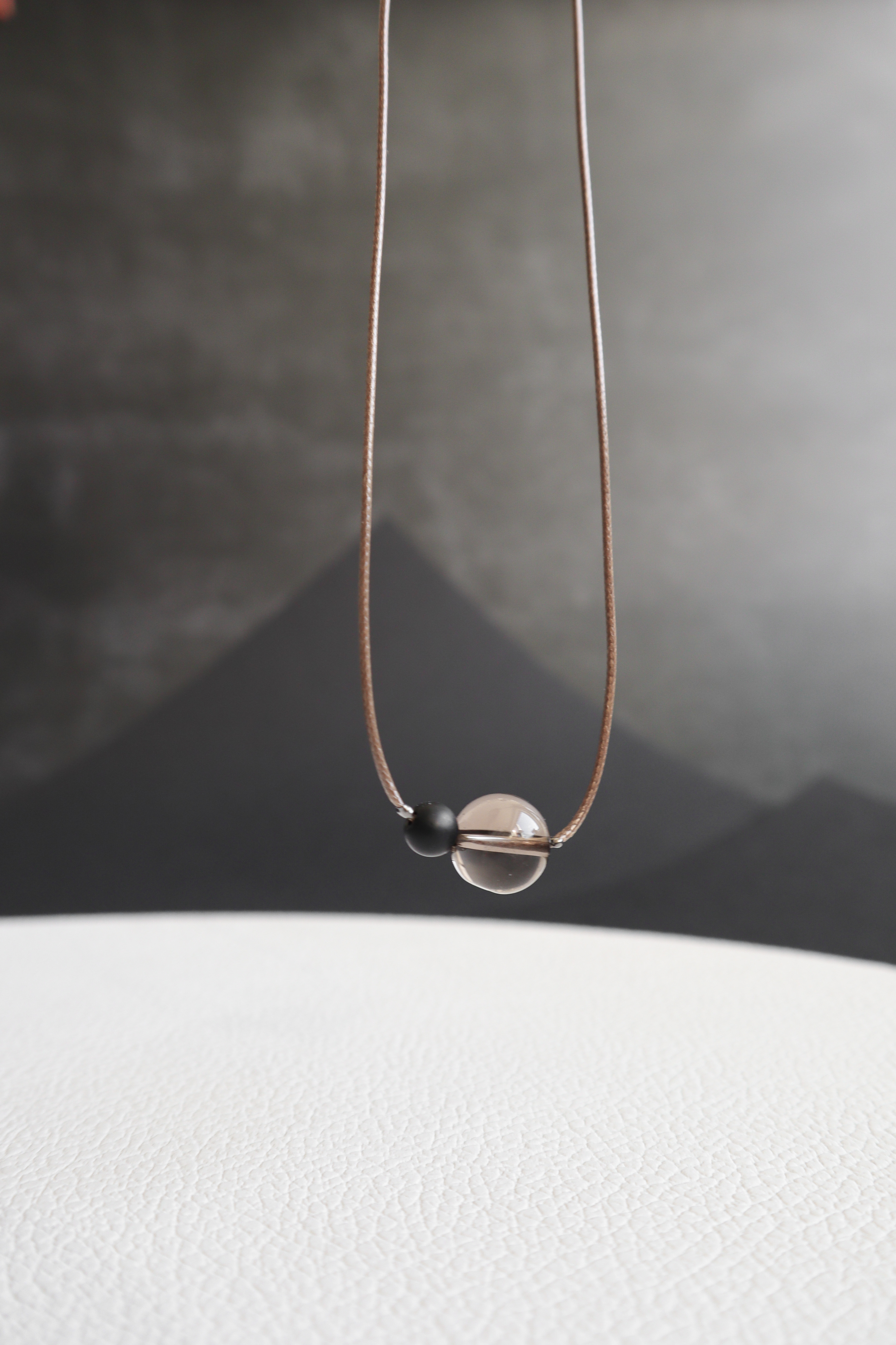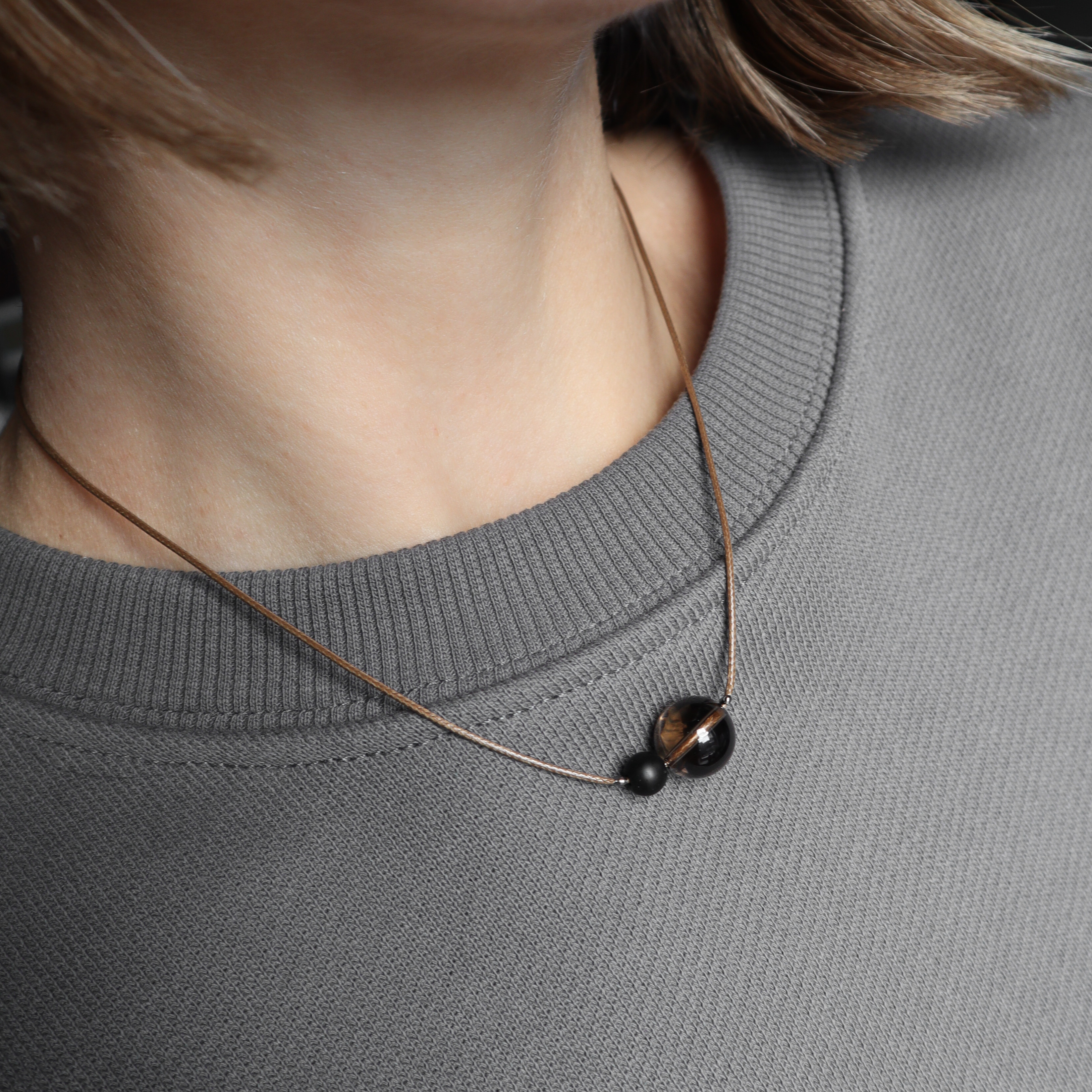 Minimalistinis pakabukas ant rudos poliesterio virvelės.