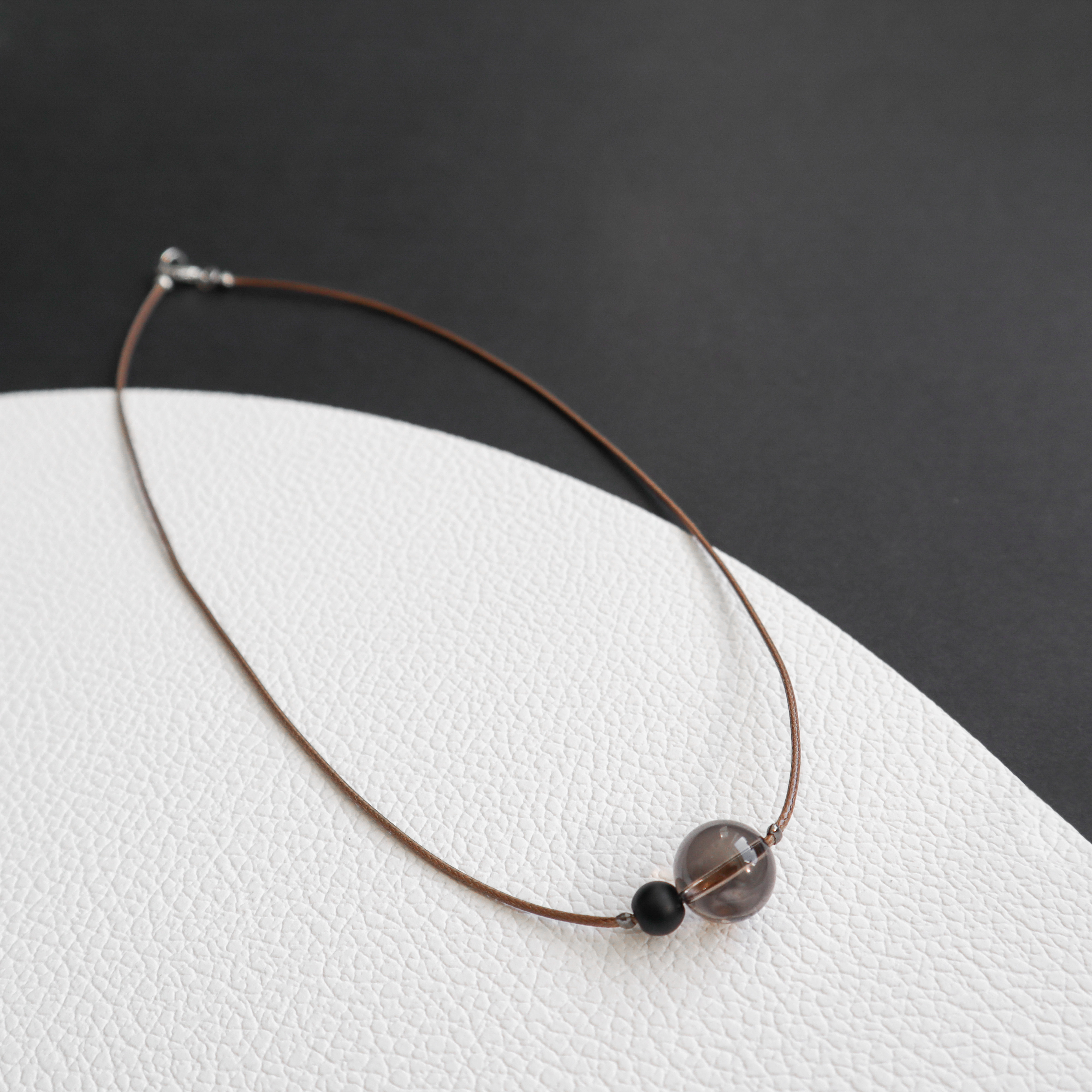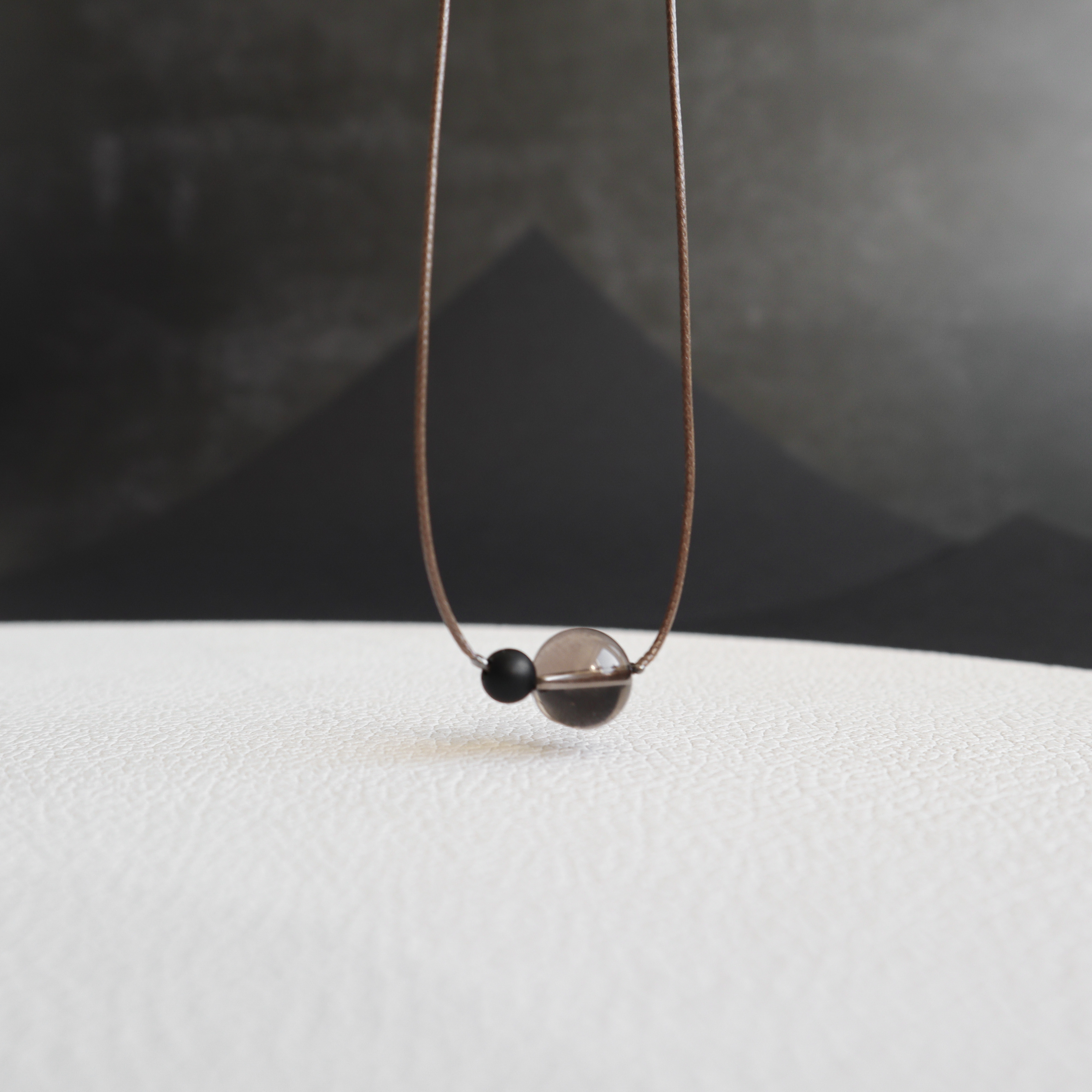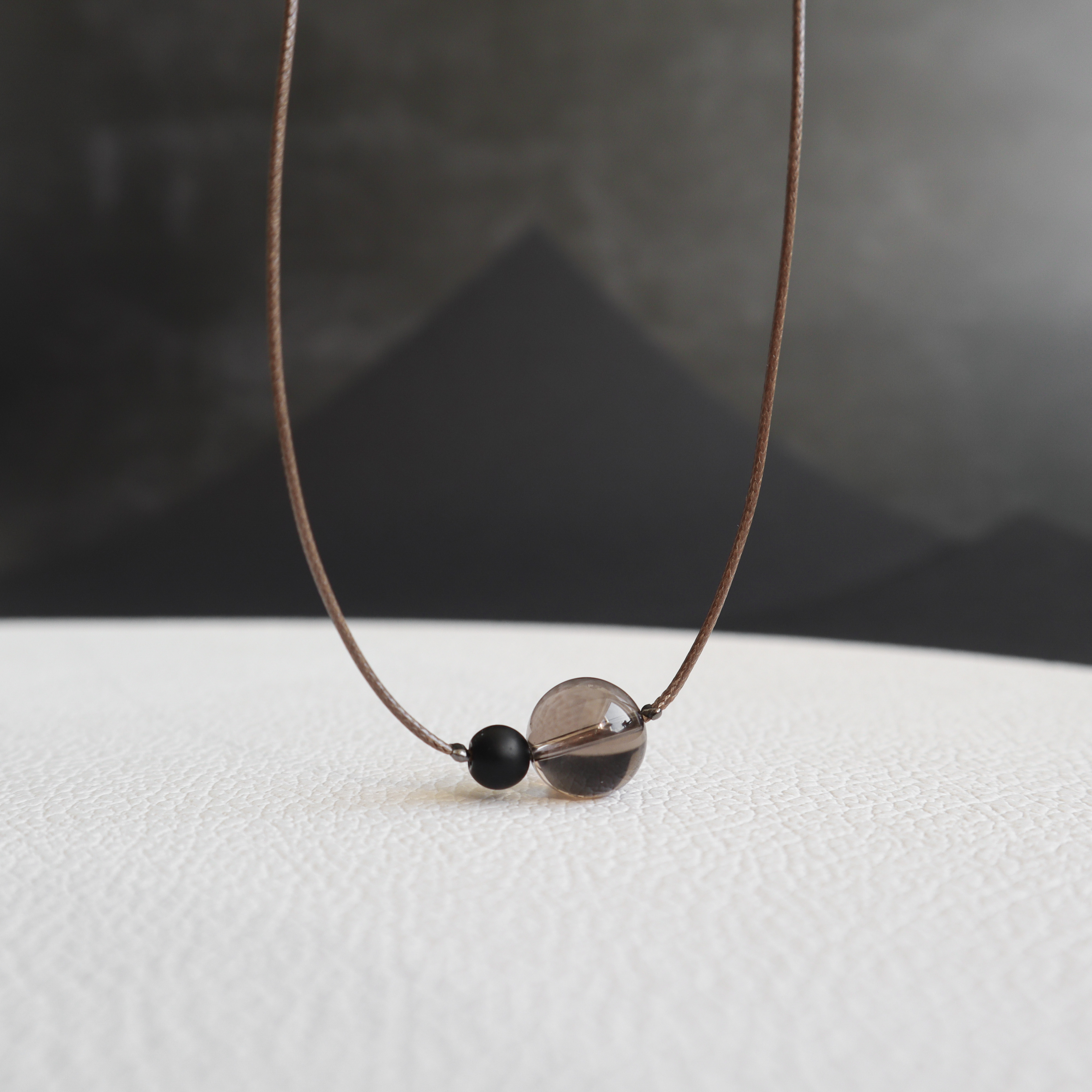 Minimalistinis pakabukas ant rudos poliesterio virvelės.