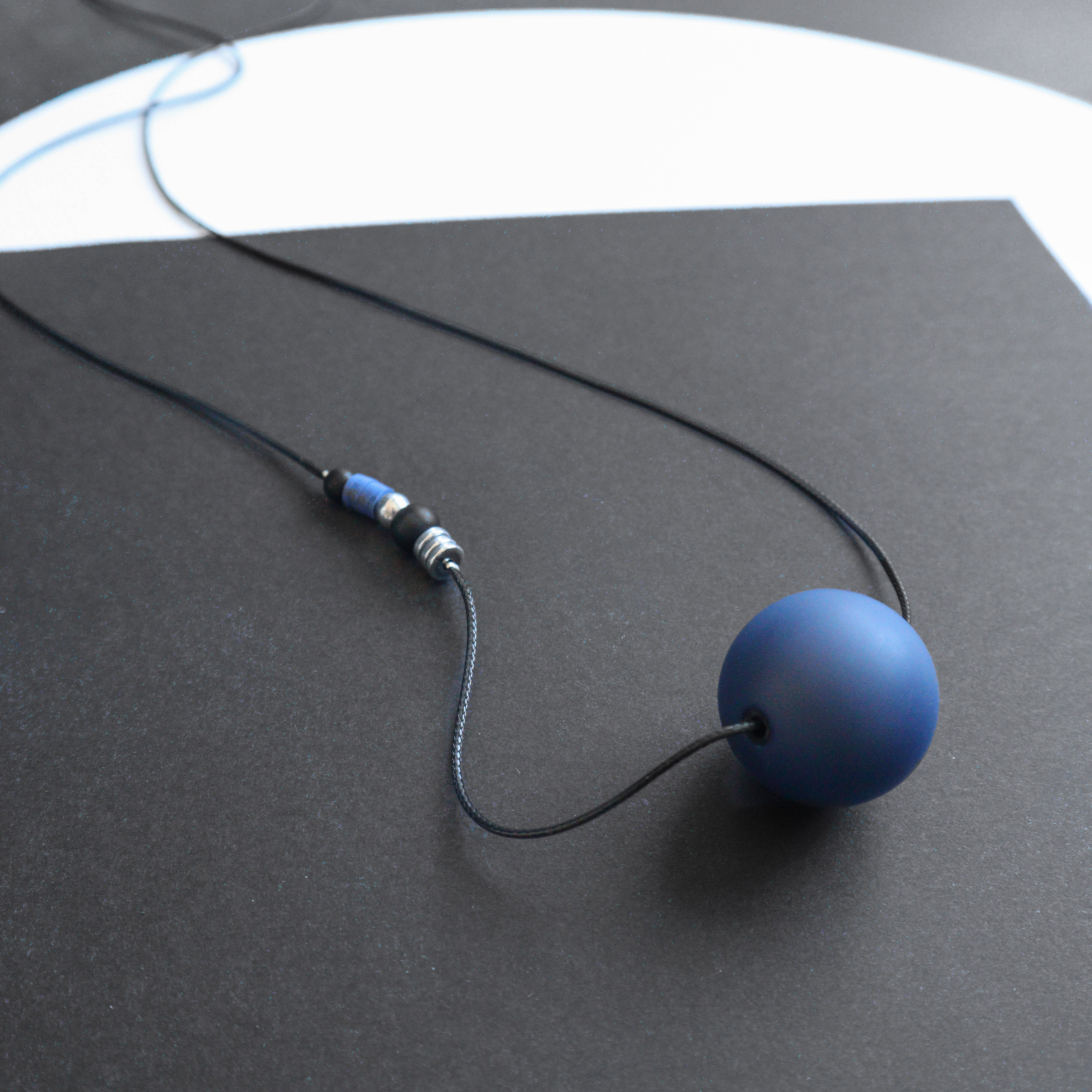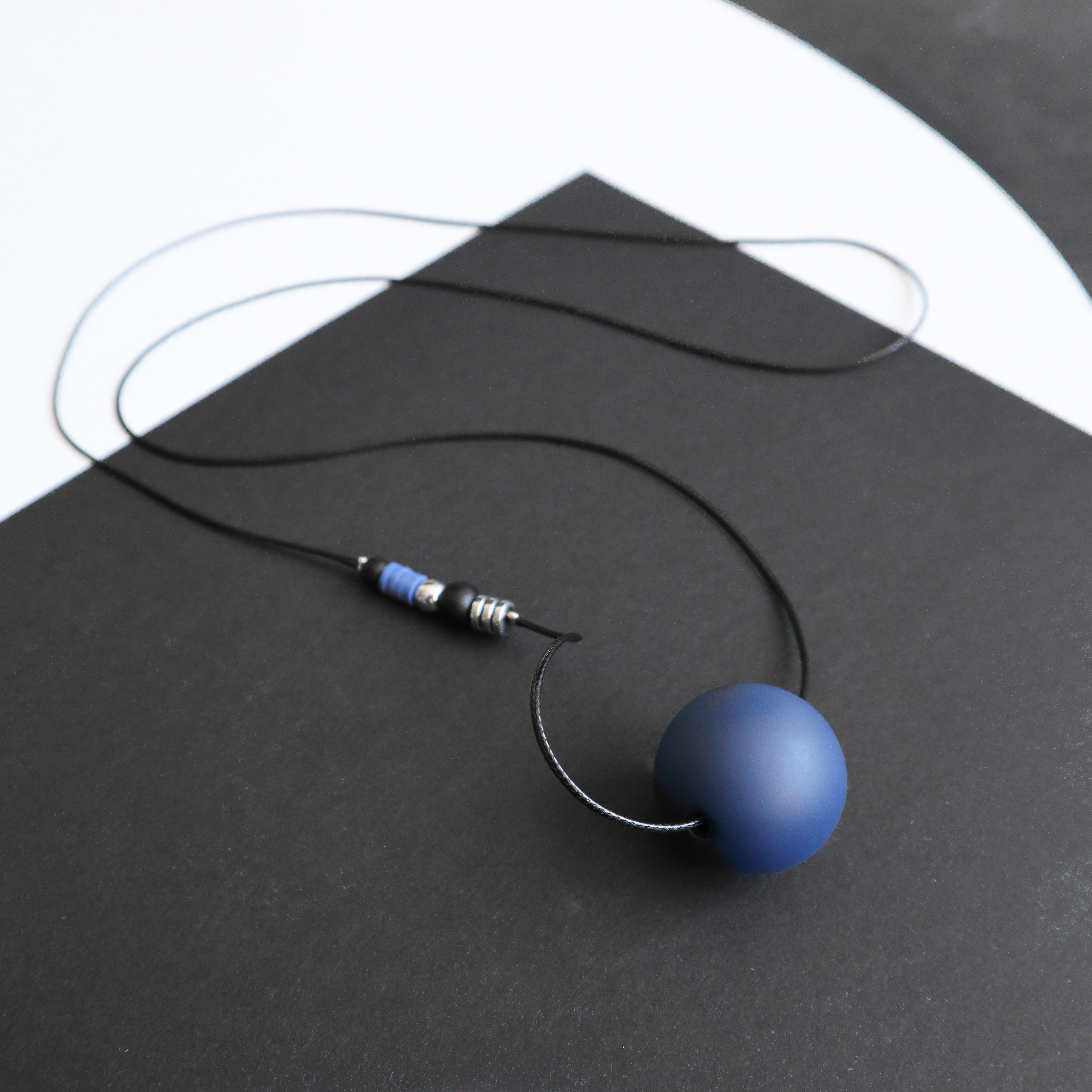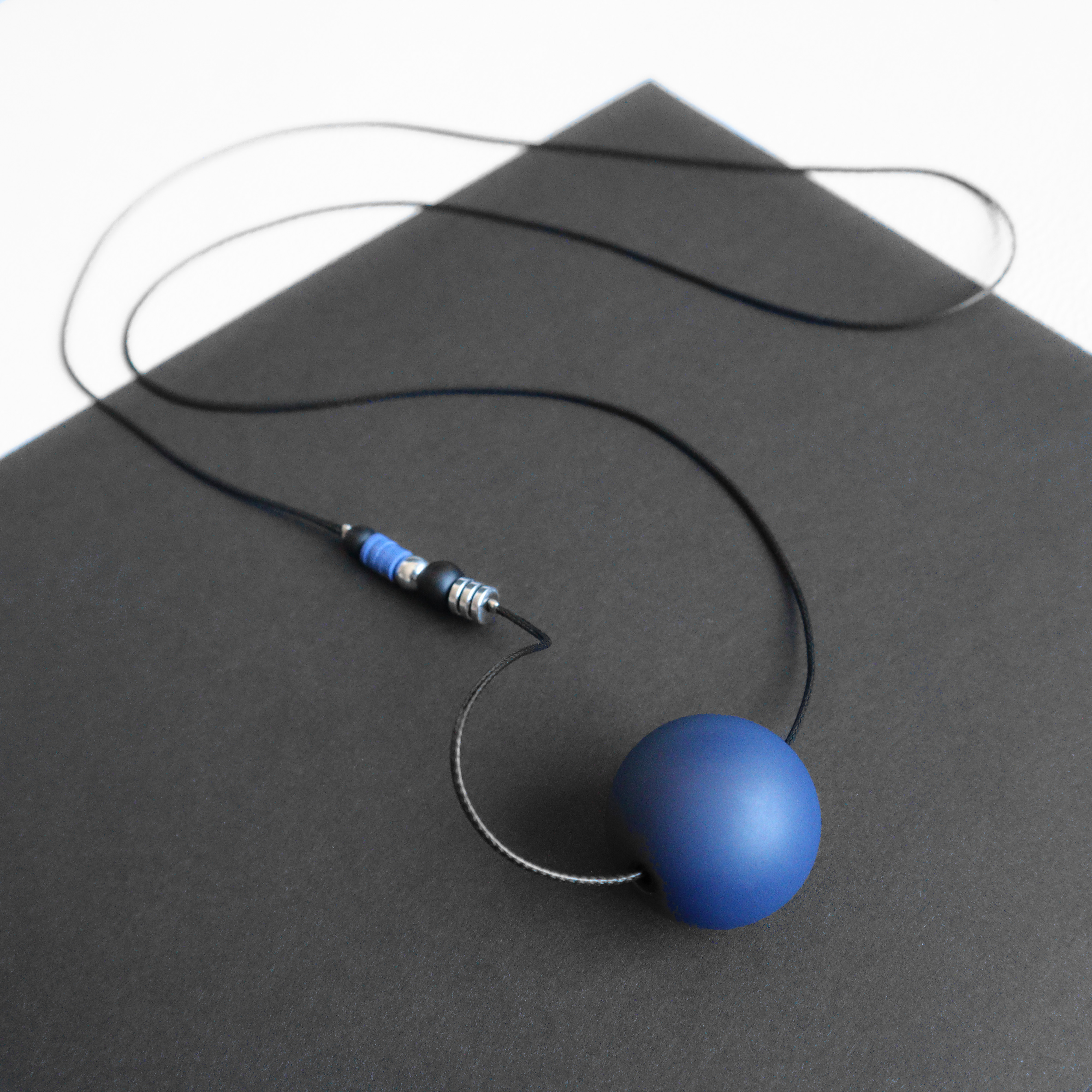 Mėlynas akrilo karolis 3 cm skersmens, hematito, šungito detalės. poliesterio virvelė.