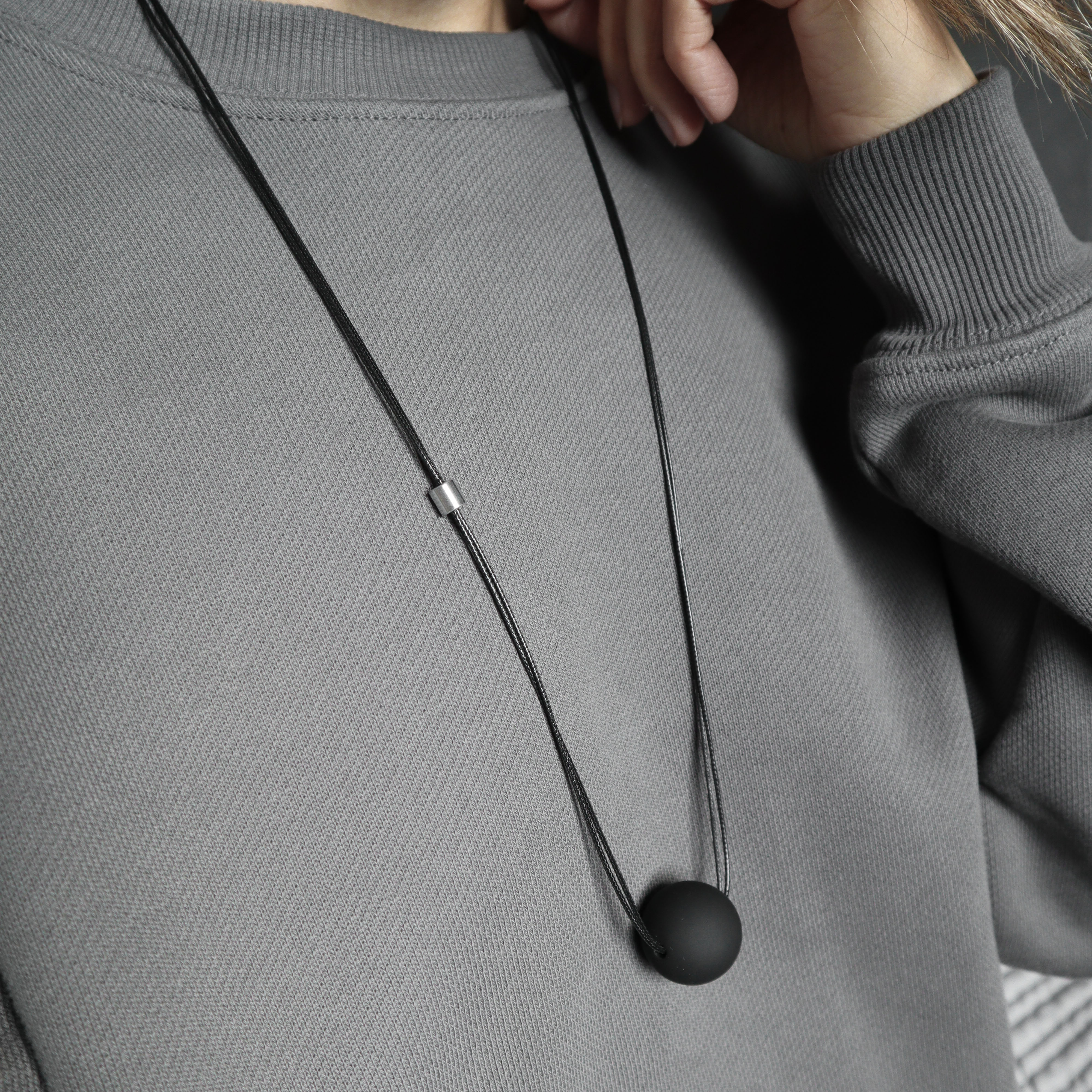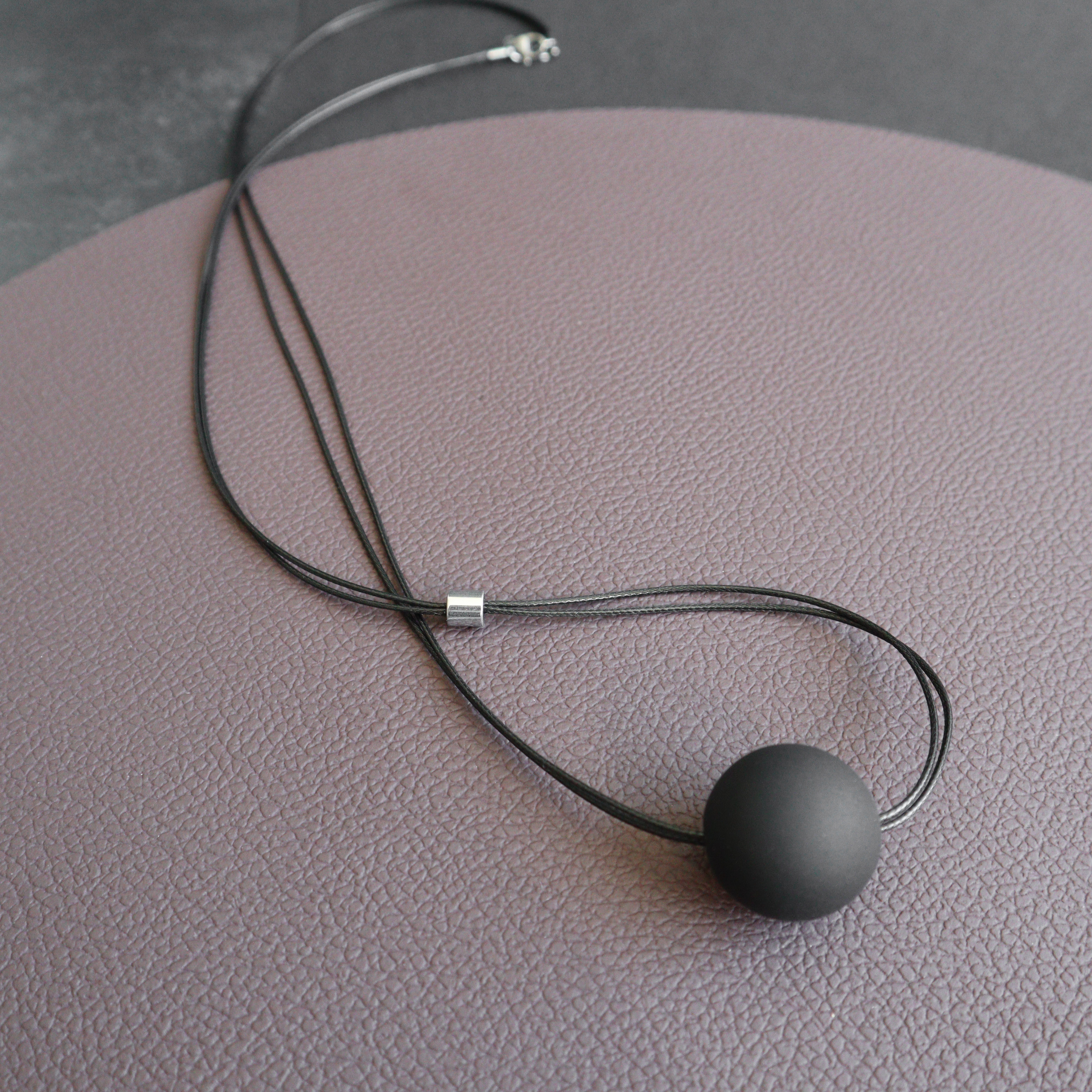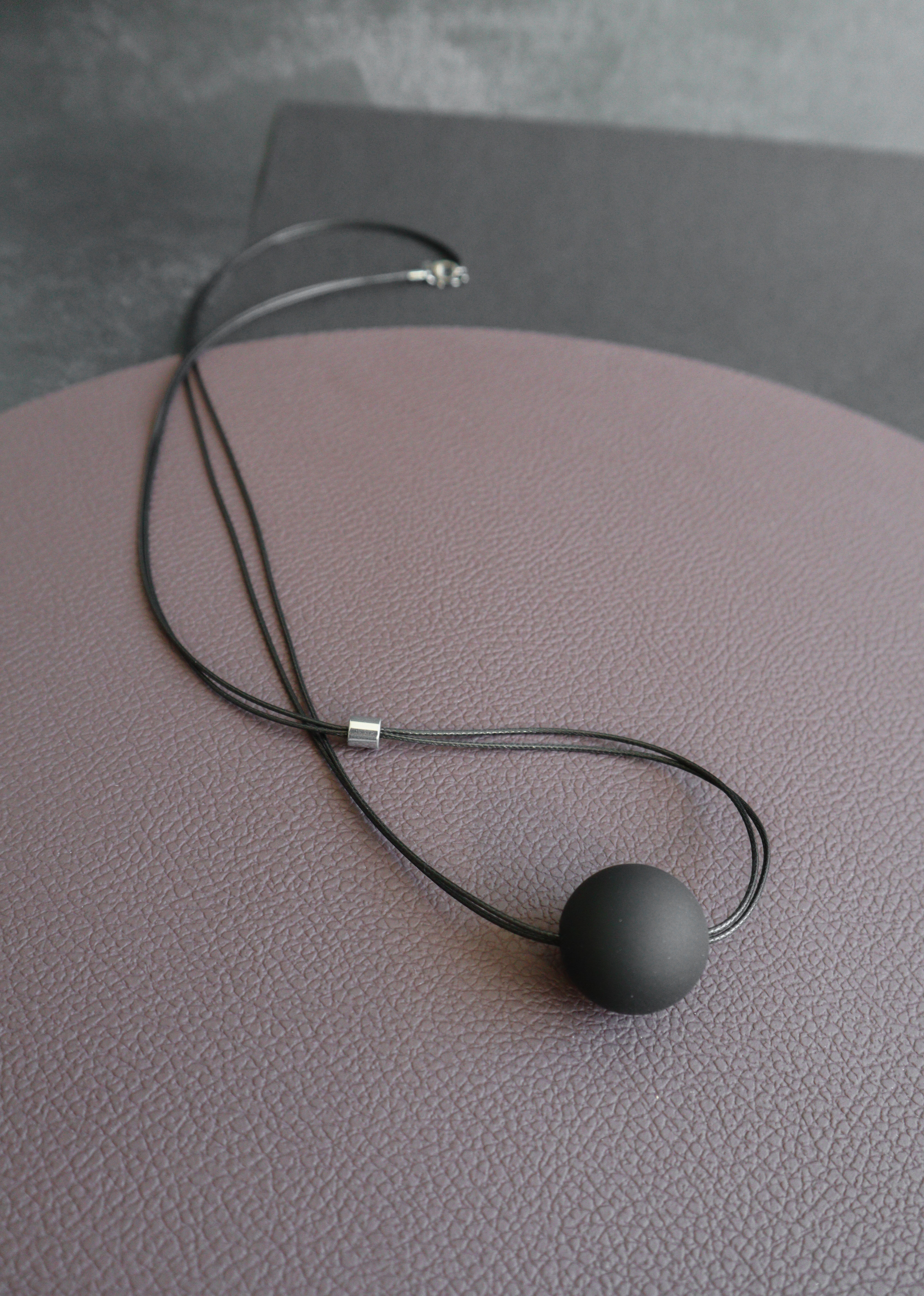 Juodas matinis akrilo burbulas ant dvigubos virvelės. Detalė - sidabro spalvos hematitas.