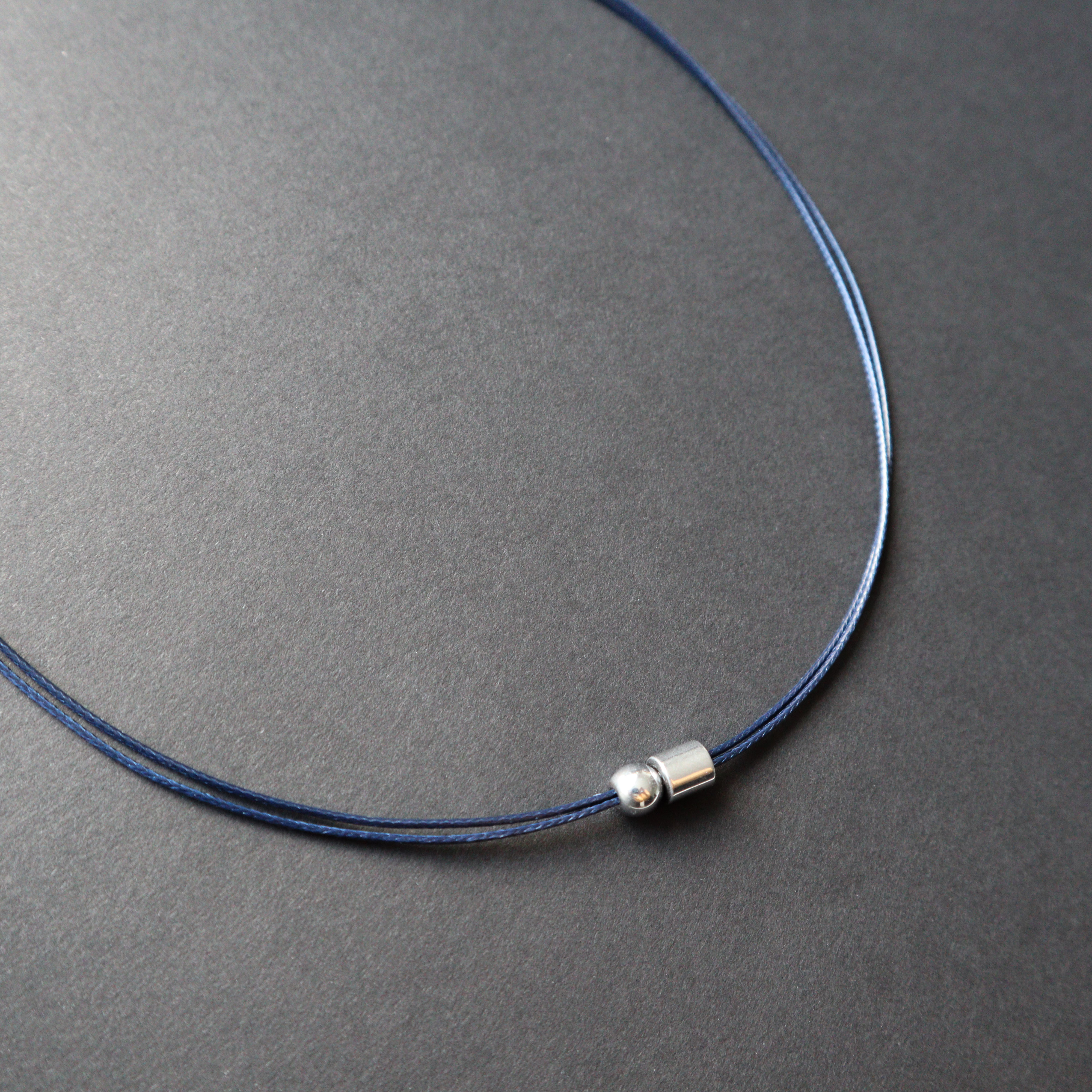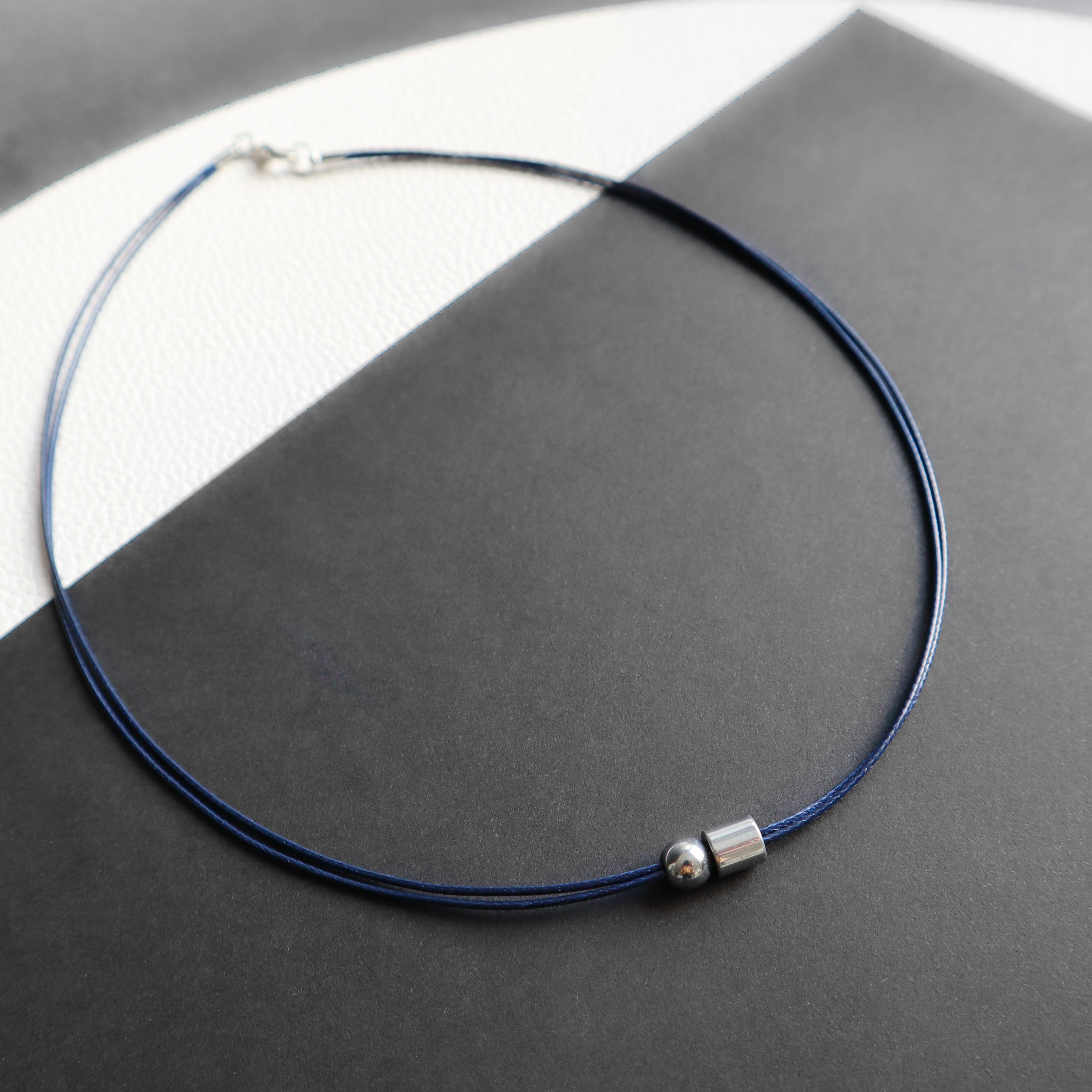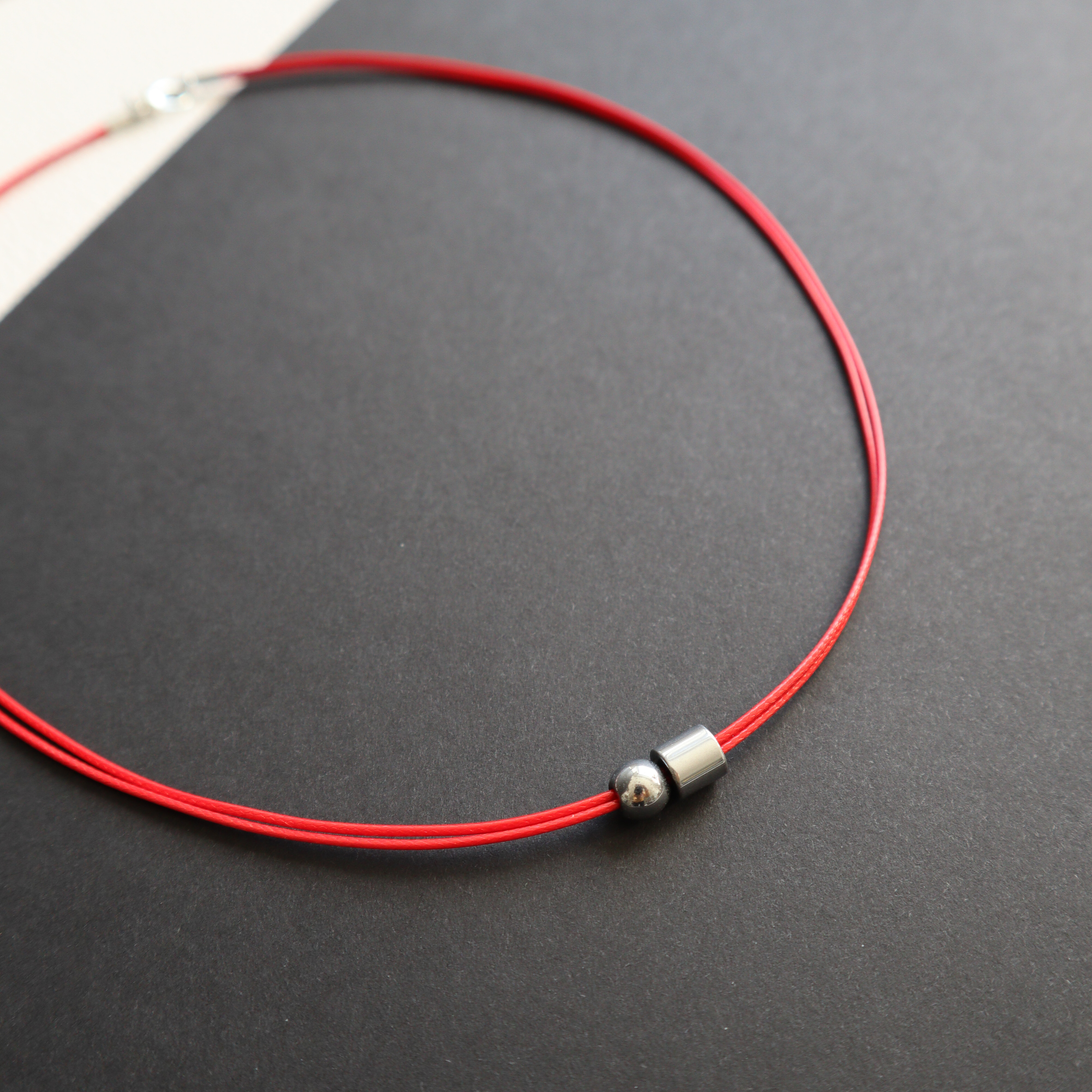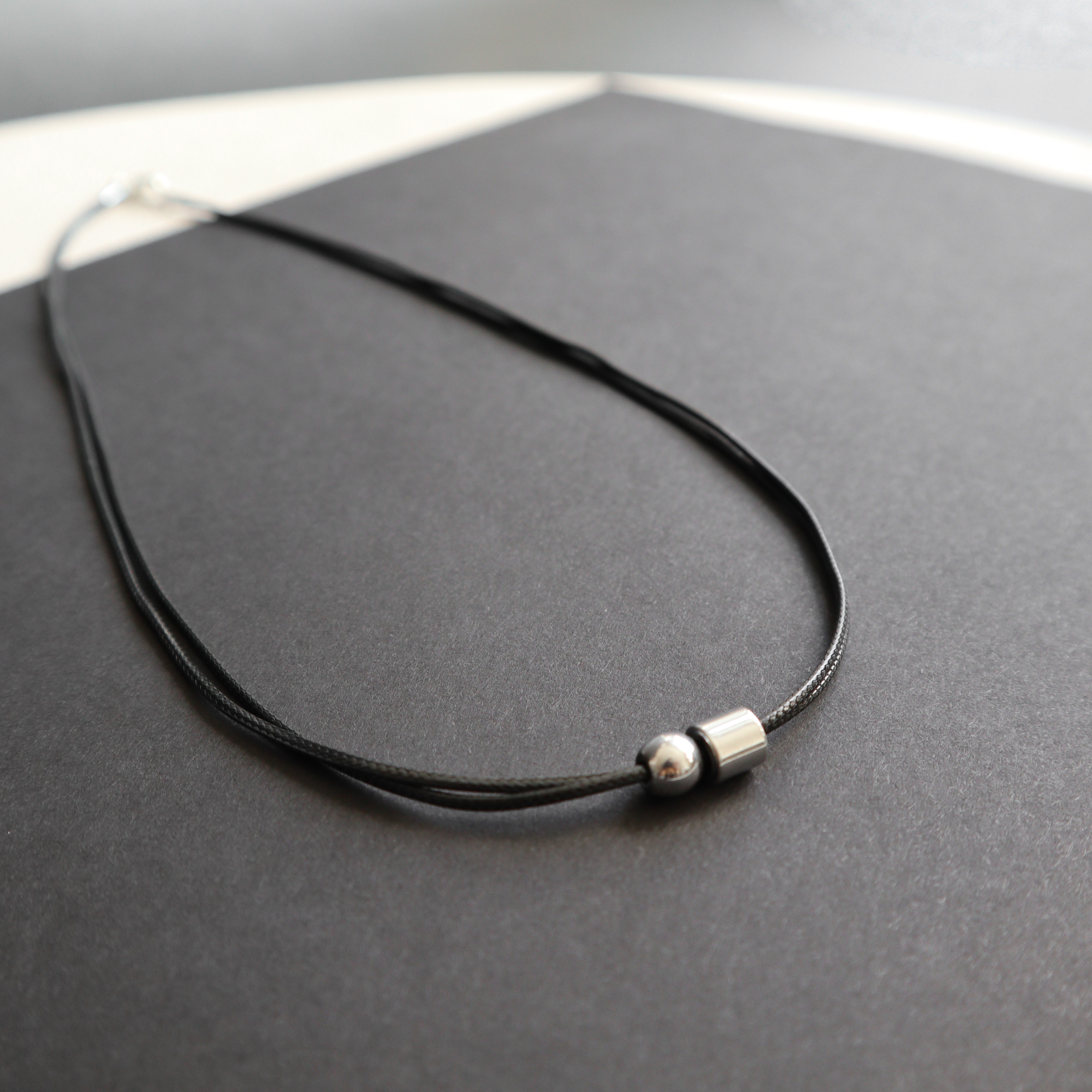 Dvigubos poliesterio virvelės ir sidabro spalvos hematito detalių vėrinys.