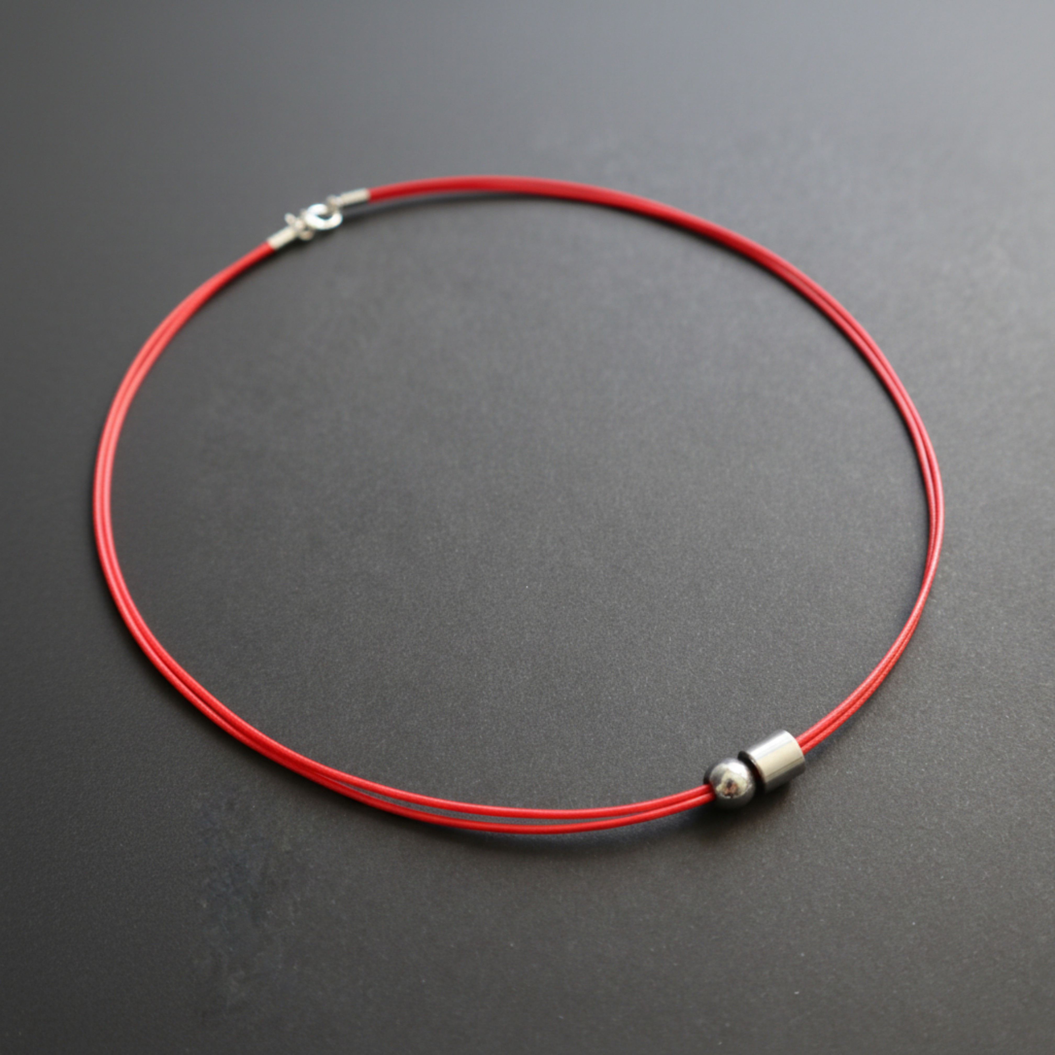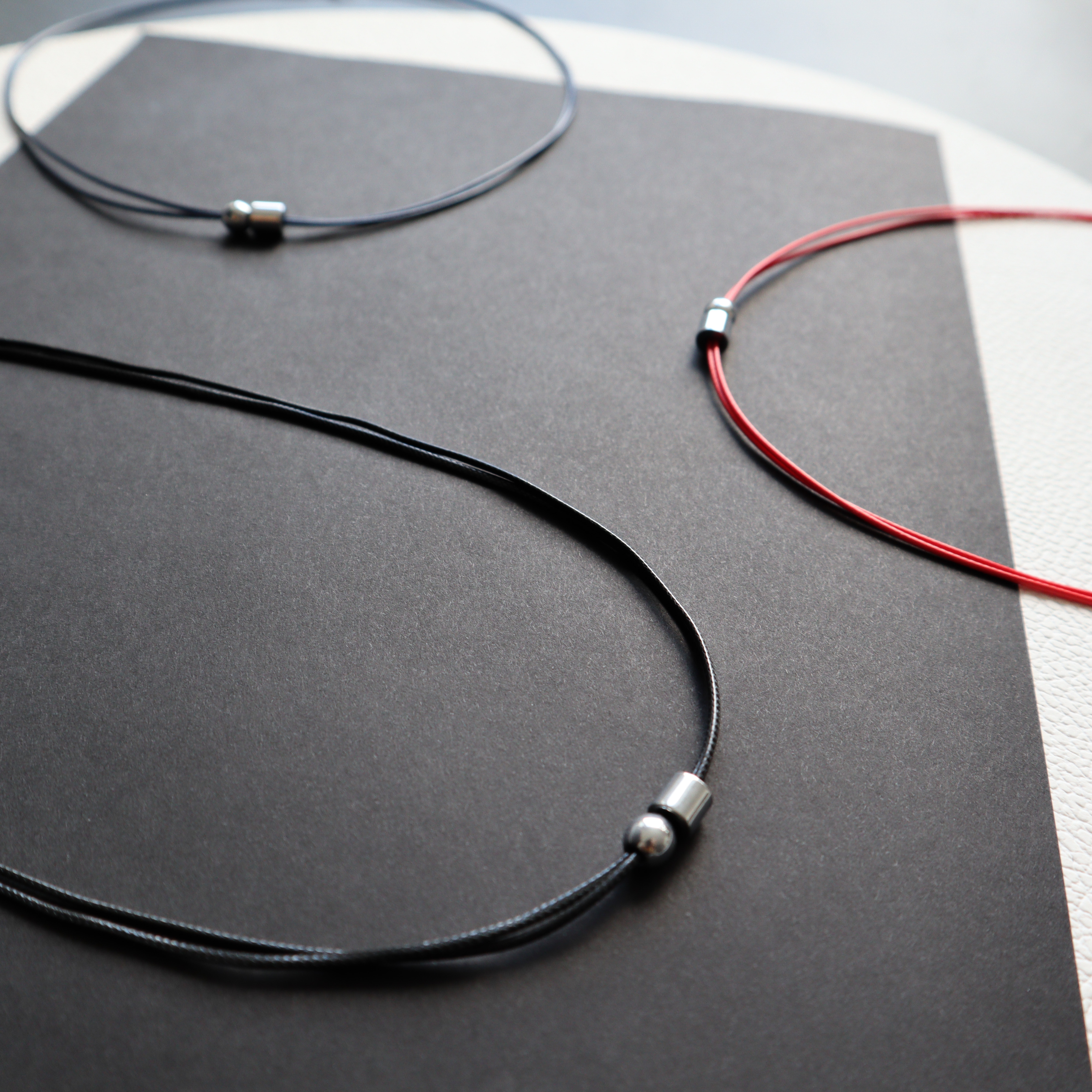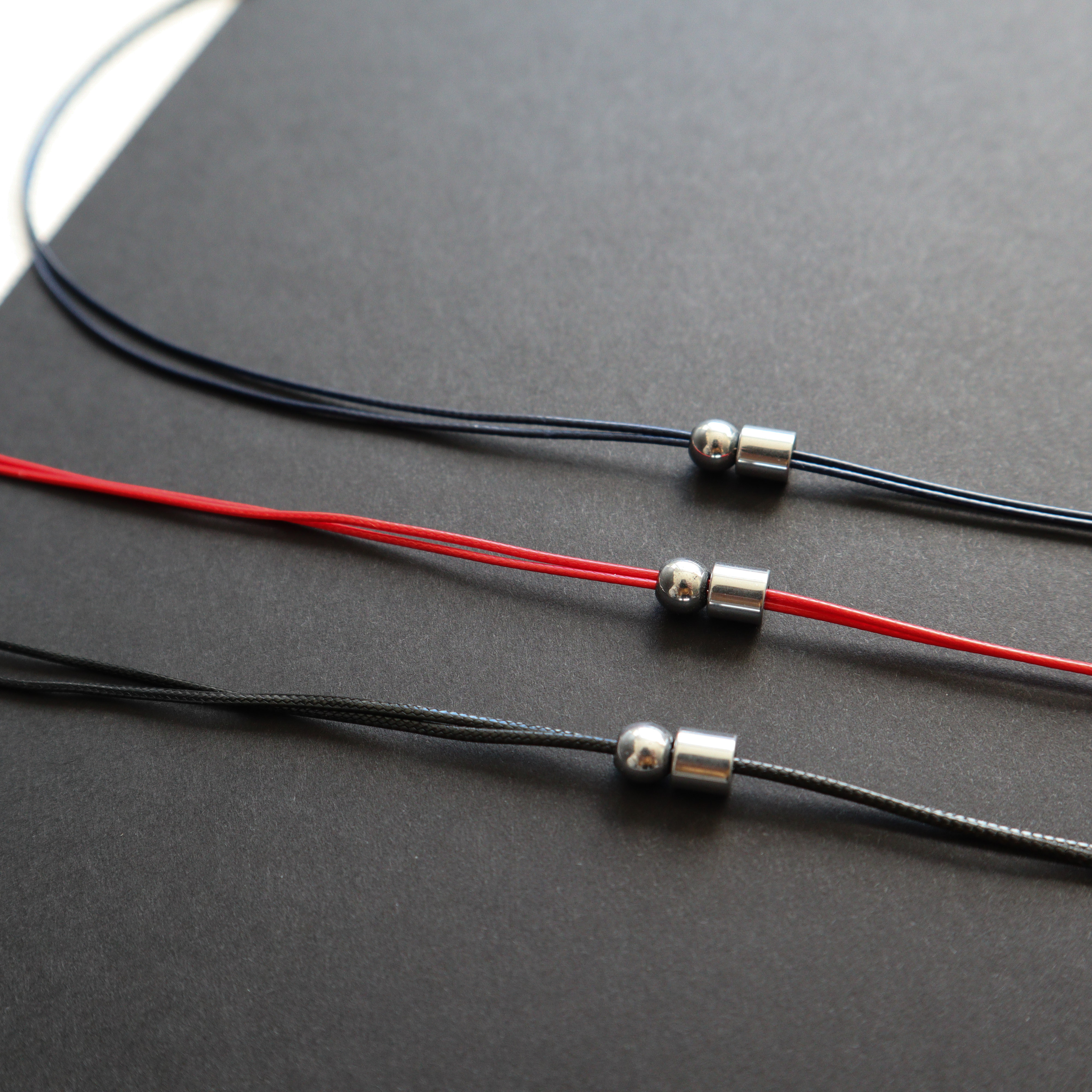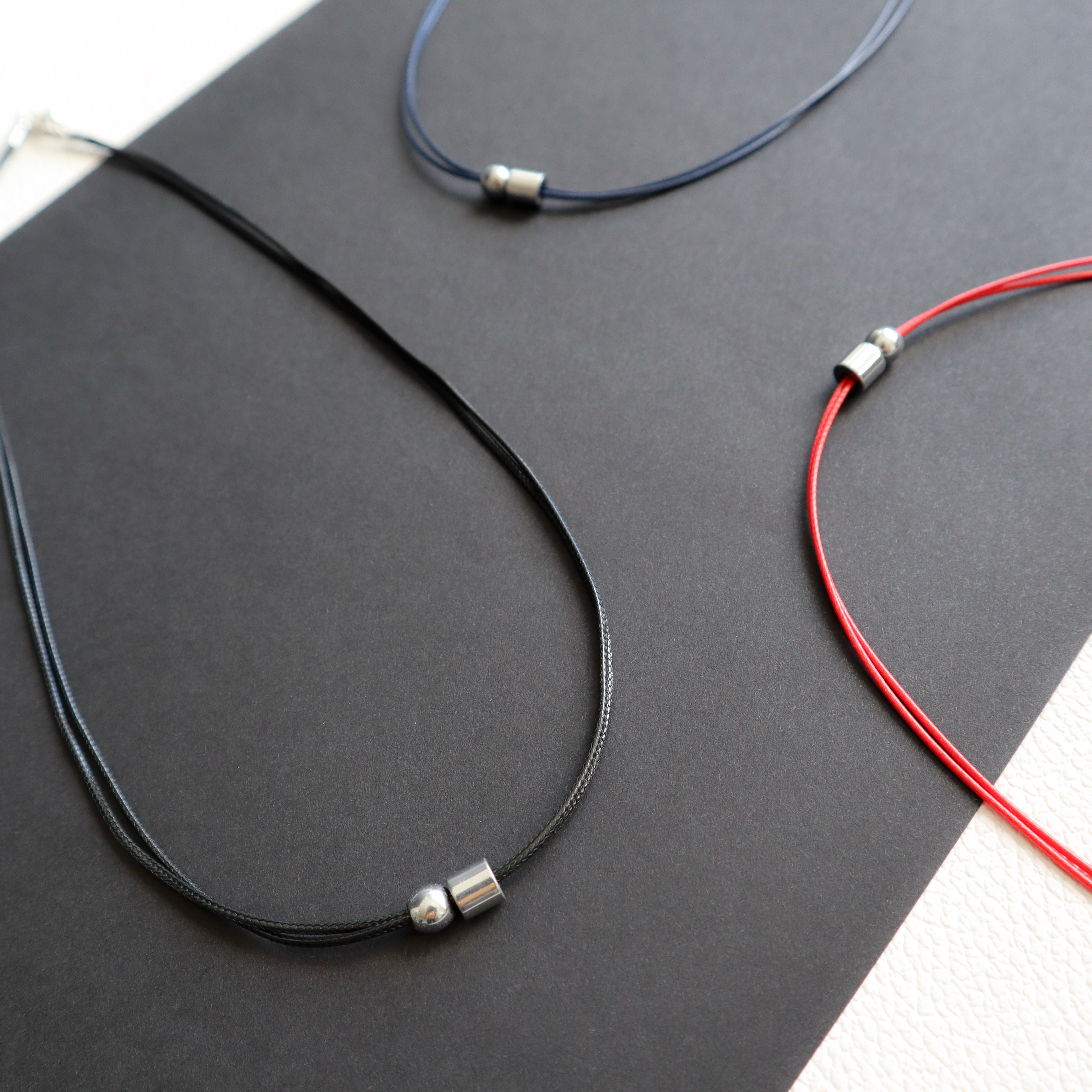 Dvigubos poliesterio virvelės ir sidabro spalvos hematito detalių vėrinys.