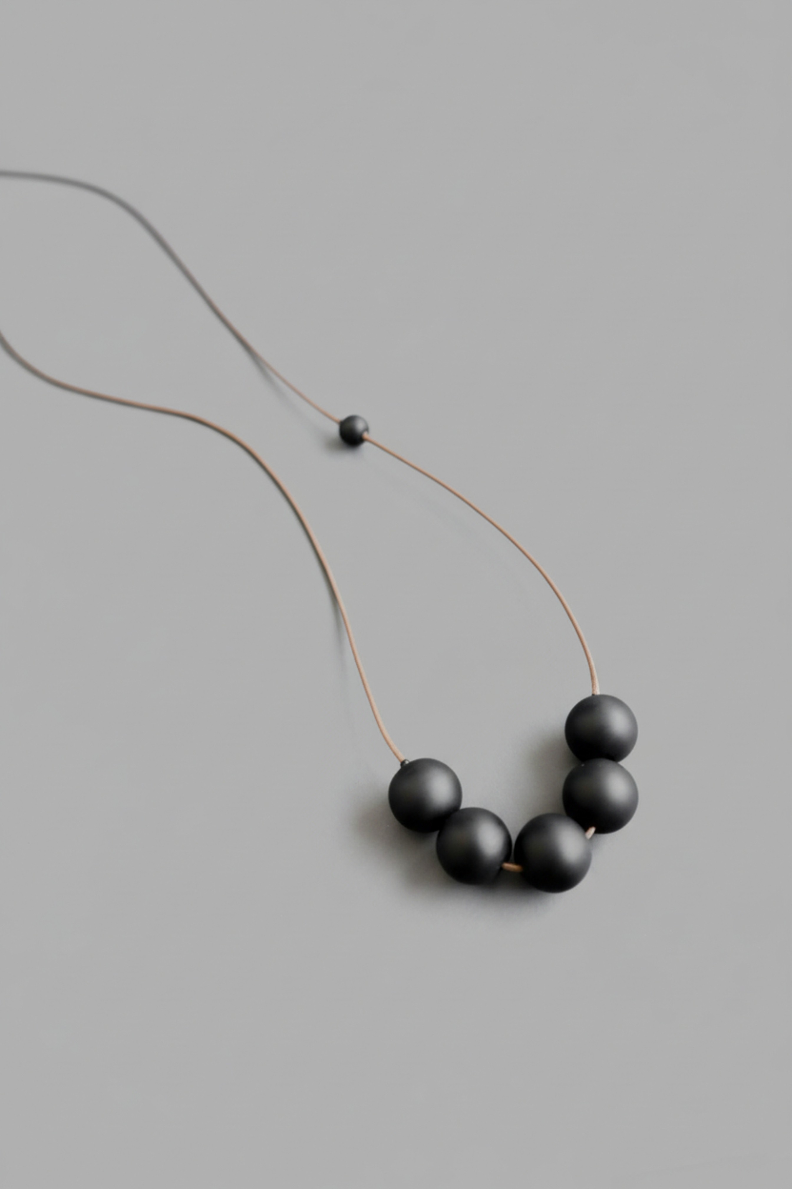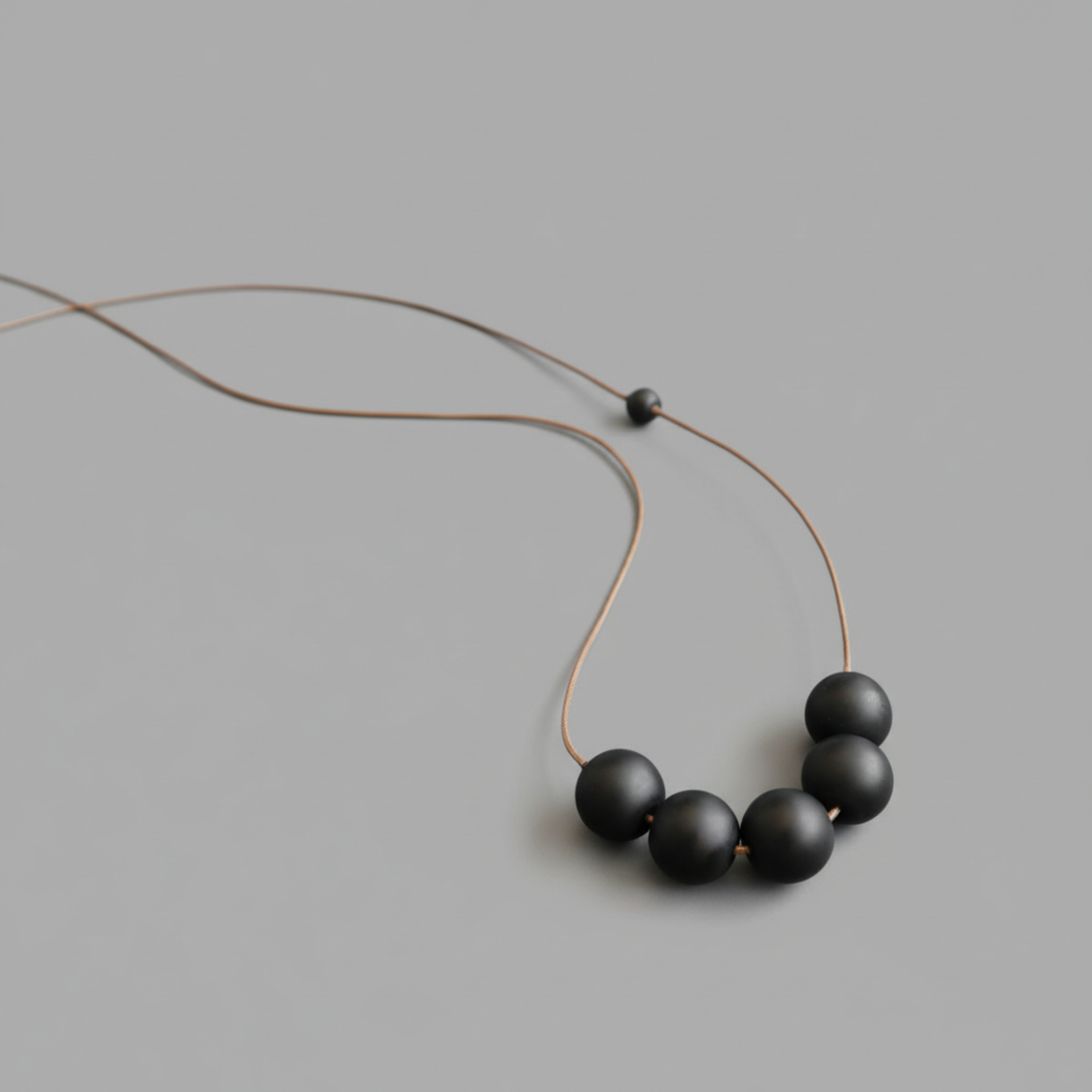 Ilgas juodo šungito karolių vėrinys ant poliesterio virvelės. Šis akmuo vertinamas dėl savo apsauginių savybių ir matinio juodumo.