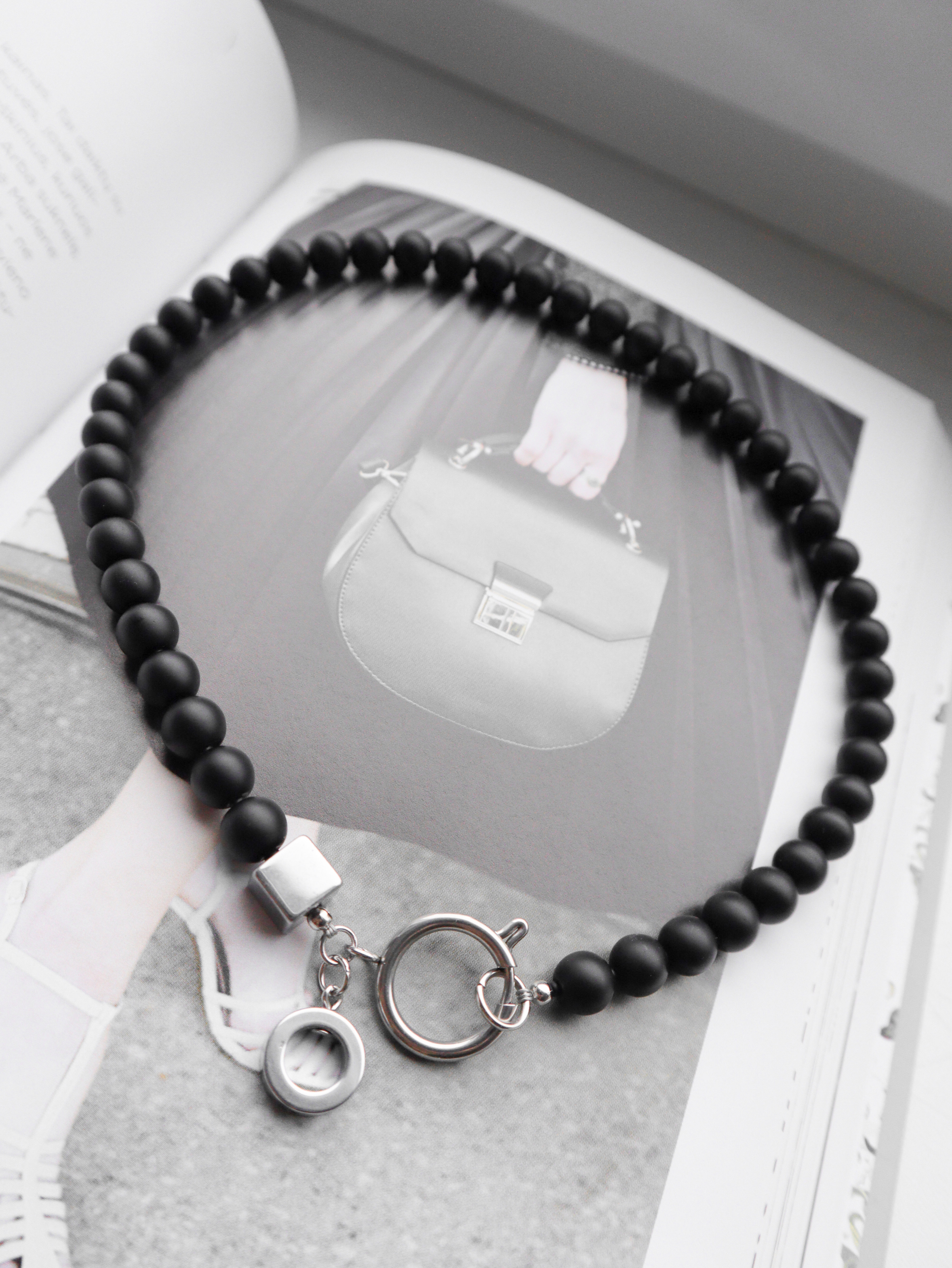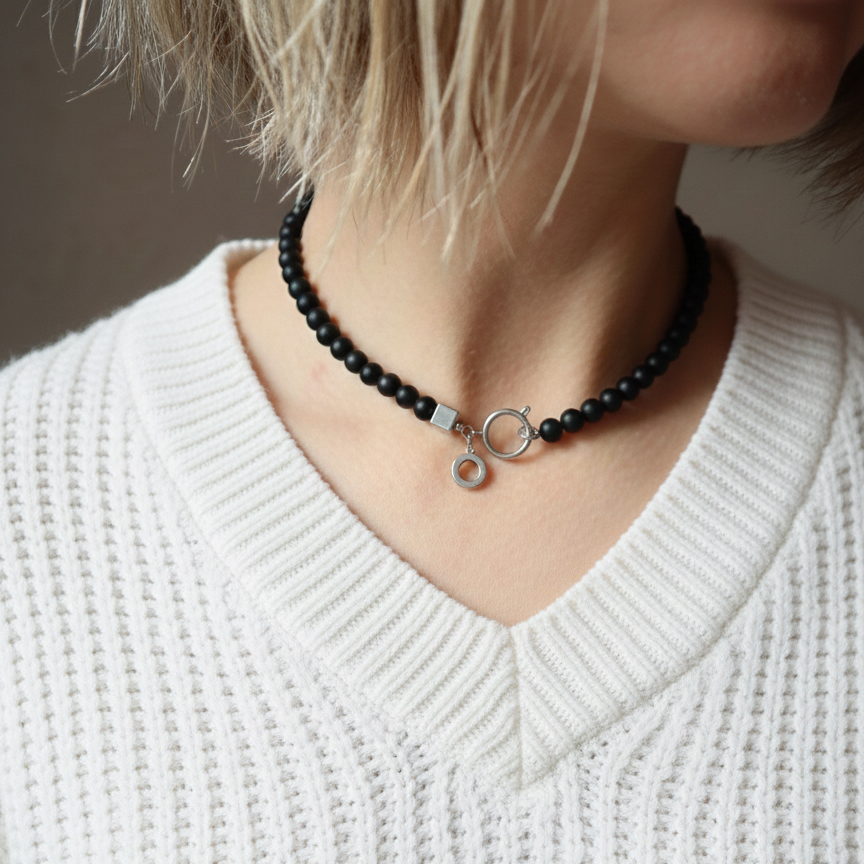Juodo trumpas šungito karolių kaklo papuošalas.