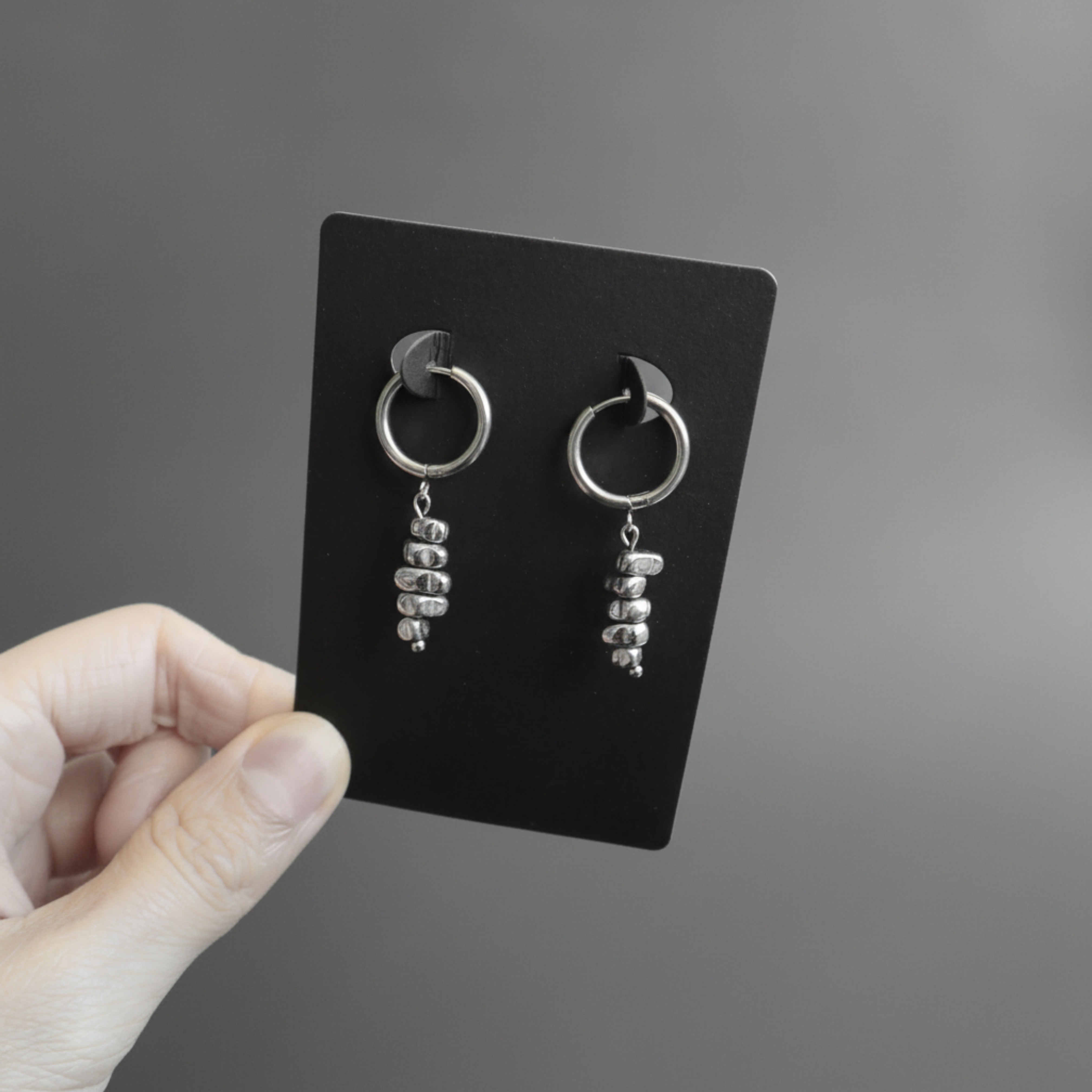 Nerūdijančio plieno ir sidabro spalvos hematito akmens auskarai.