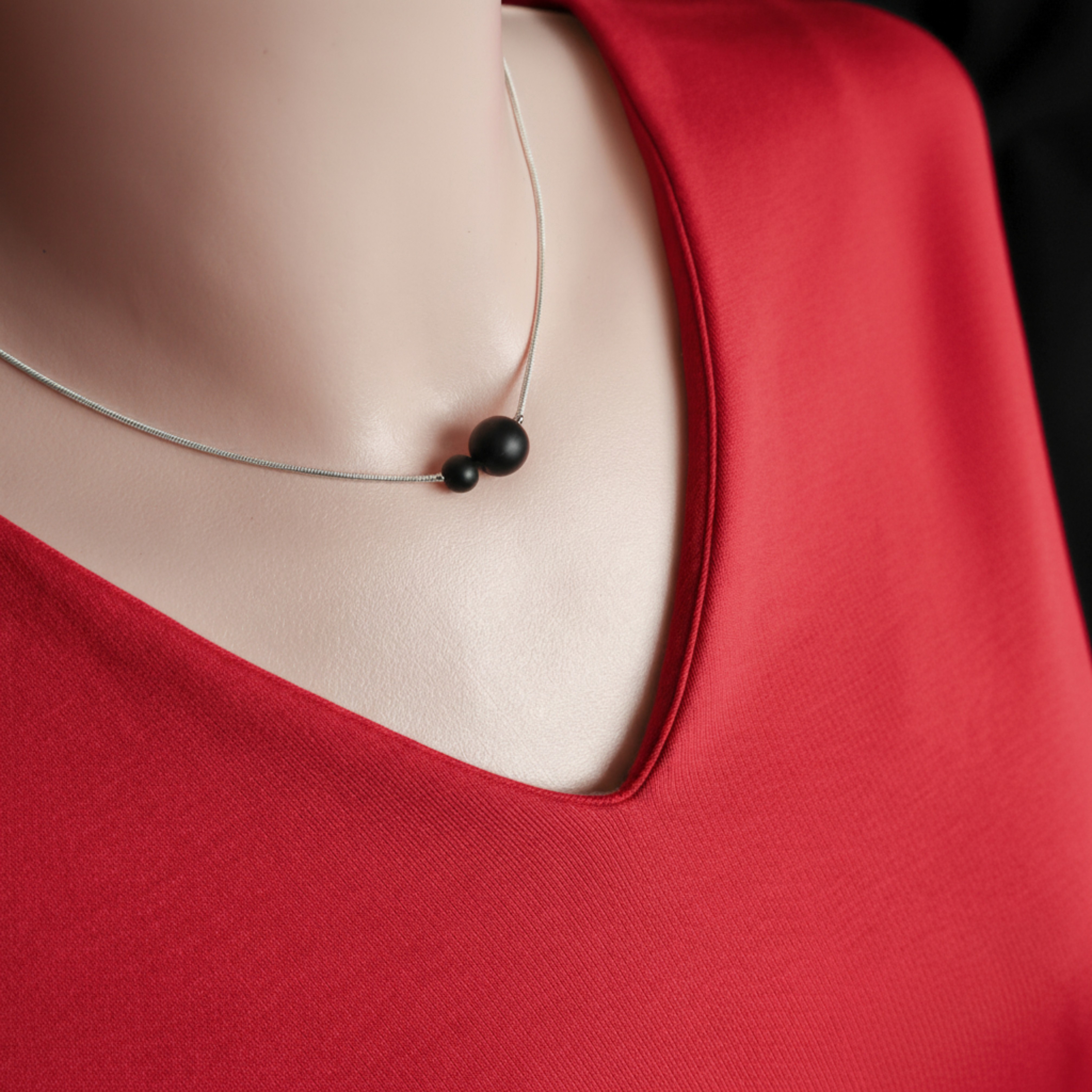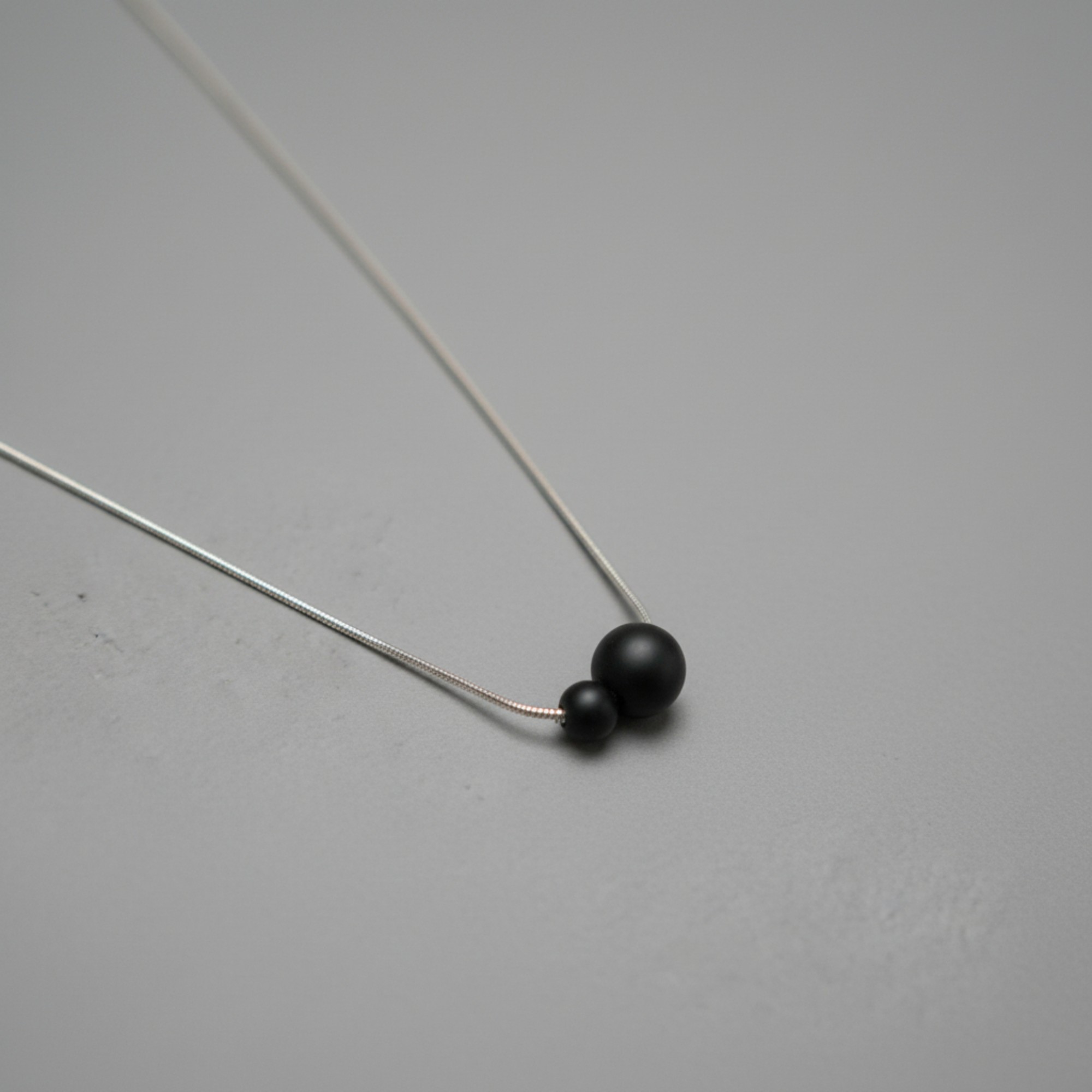 Minimalistinė sidabro spalvos metalo grandinėlė su juodo akmens detalėmis. Ilgis apie 40 cm.