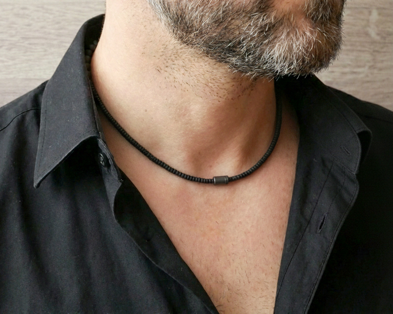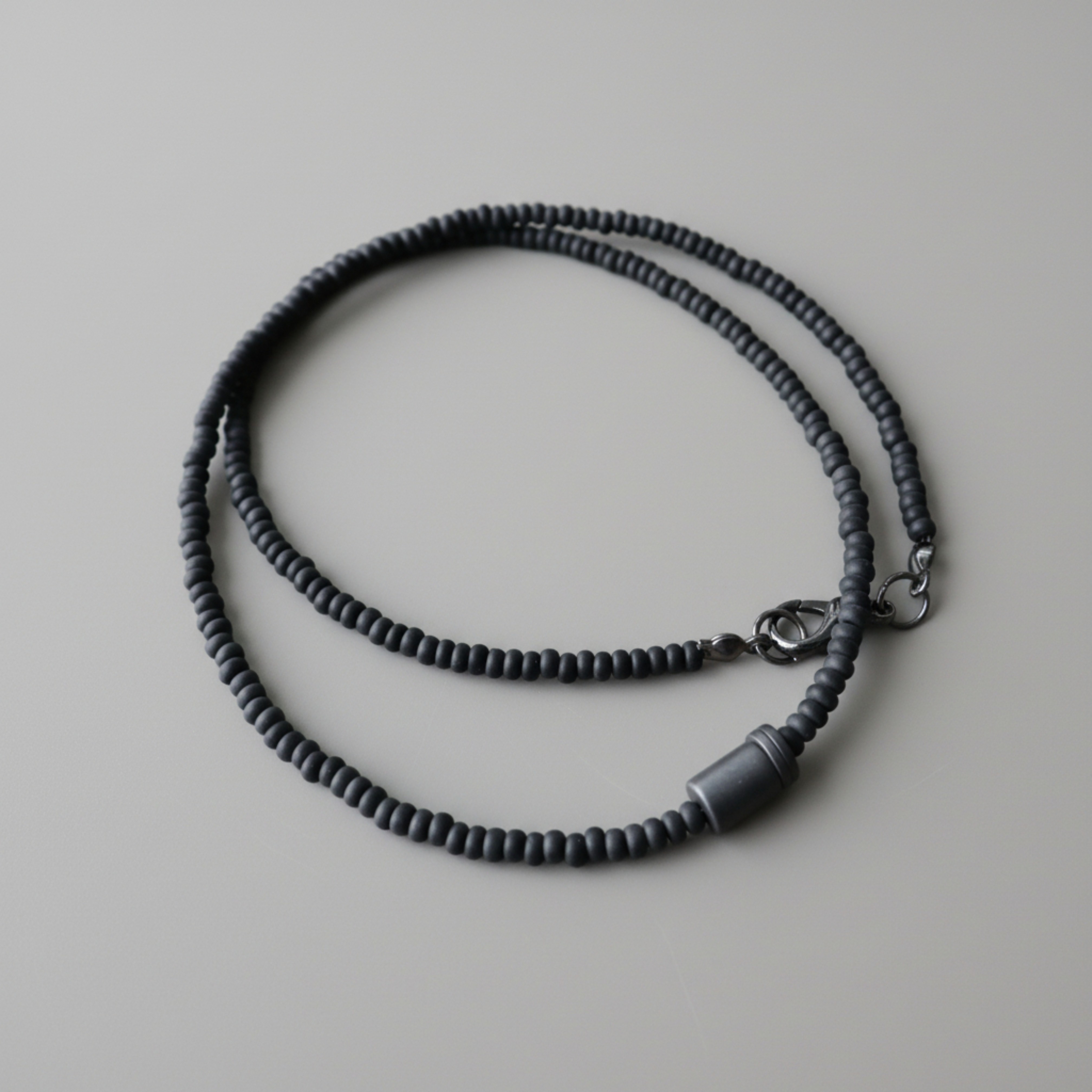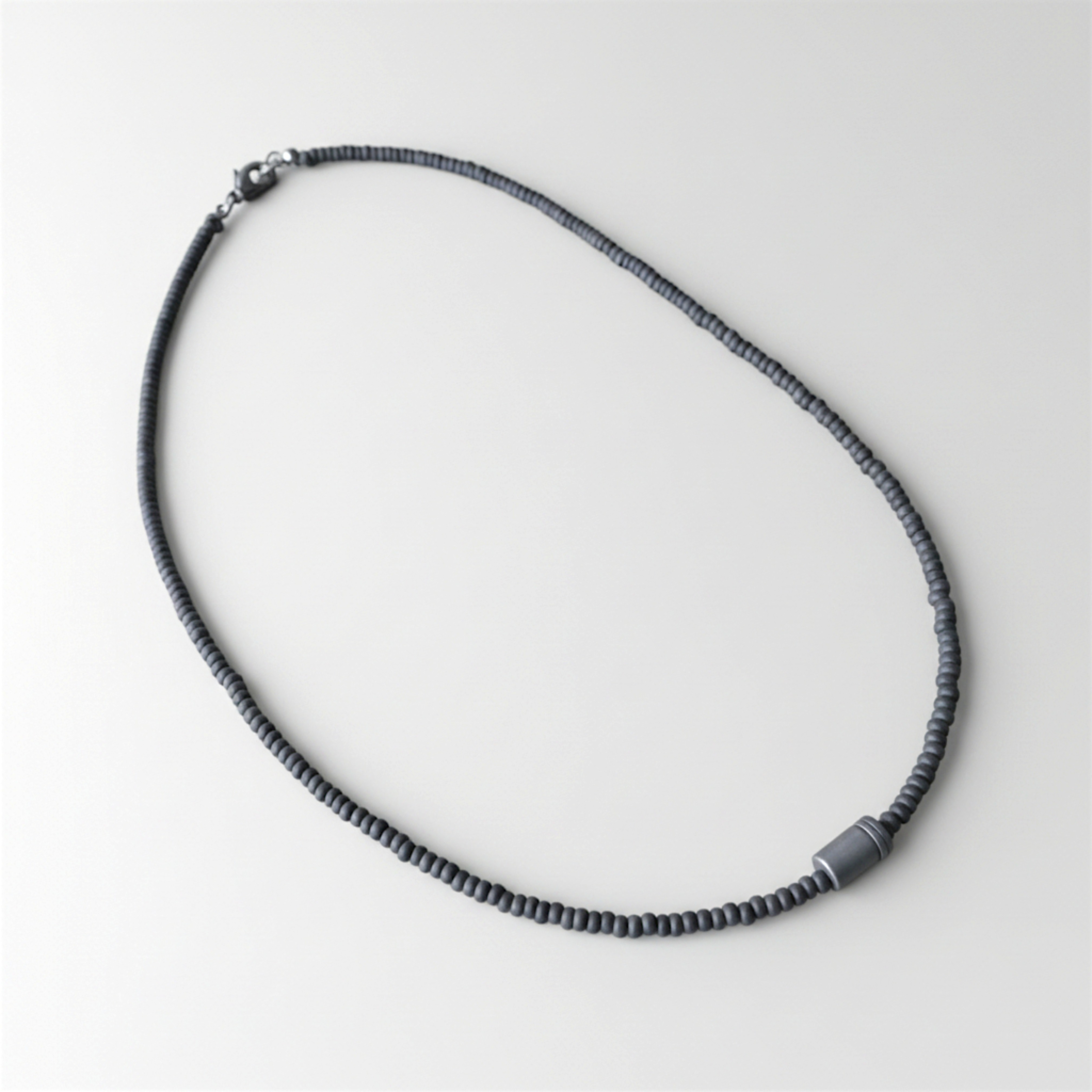 Juodų matinio stiklo karolių ir pilko hematito akmens pakabuko vėrinys.